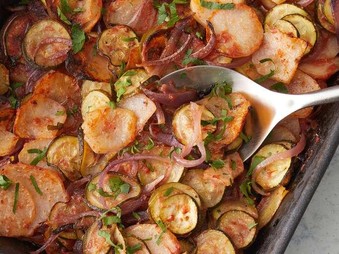 - Spread potatoes, zucchini, and red onions in an extra-large baking dish (9×13-inch or larger, or 2 baking dishes).