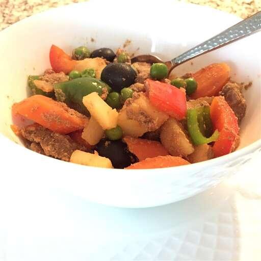 A Filipino beef stew traditionally cooked with goat, but it’s usually not available in most markets. You can get creative with this dish such as adding garbanzo beans, peas, and raisins. Optional: add 4 ounces of liver pate in place of tomato paste. Serve hot over a bed of rice.