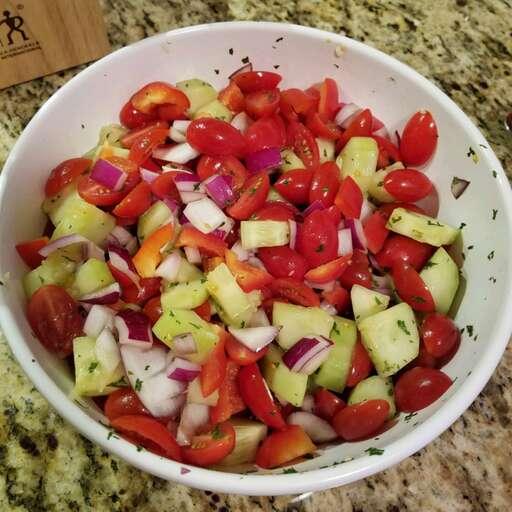 - In a large bowl, toss together the tomatoes, cucumber, jicama, bell pepper, and red onion. Add the lemon juice, olive oil, and parsley, and mix thoroughly to coat. Season with salt and pepper. Serve cold, or at room temperature.
