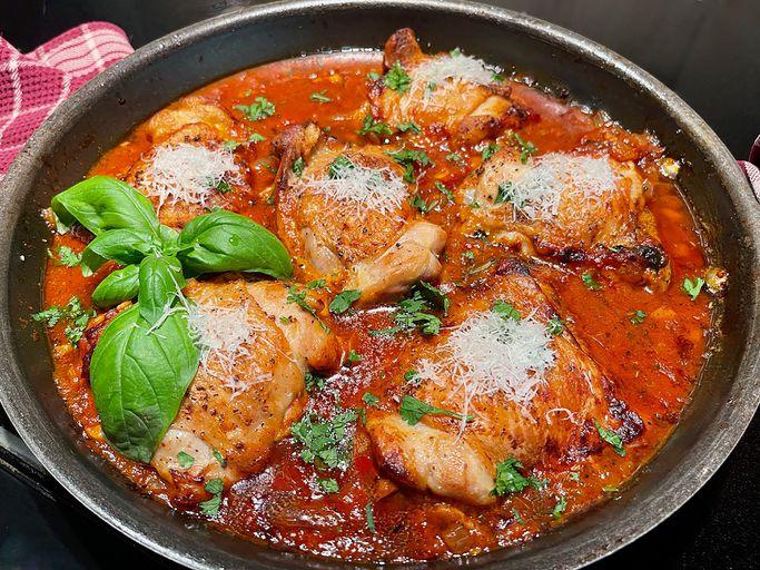 - Stir in wine, add tomato paste, and cook about 3 minutes. Add crushed tomatoes and minced basil and cook until sauce thickens slightly, about 5 minutes. Nestle browned chicken thighs, skin side up, into the sauce, and add any accumulated juices.