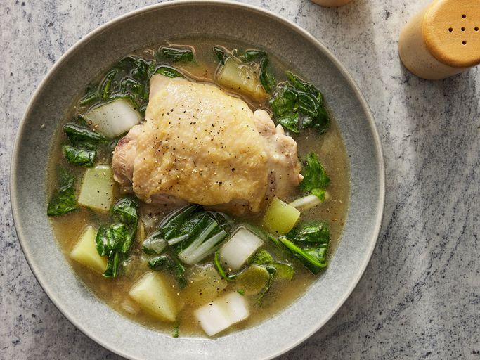 Tinola is an easy, one-pot soup from the Philippines. Chicken, chayote squash (or papaya!), bok choy, and spinach are simmered with fresh ginger in a savory broth that’s often served with white rice.