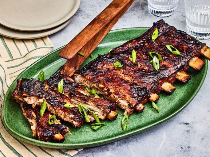 - Mix hoisin sauce, ketchup, honey, soy sauce, sake, rice vinegar, lemon juice, ginger, garlic, and five-spice powder together in a shallow glass dish. Place ribs in the dish and turn to coat. Cover and marinate in the refrigerator for 2 hours or up to overnight.