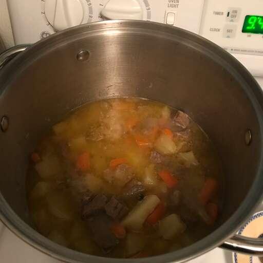 - Add potatoes, carrots, and celery; simmer for 1 1/2 more hours.