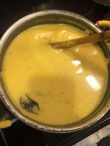 1. Mix together water, yogurt, and chickpea flour in a large saucepan until smooth; add green chile peppers, ginger, sugar, turmeric, and salt. Bring to a boil, then immediately reduce heat to low and simmer for 5 to 10 minutes.