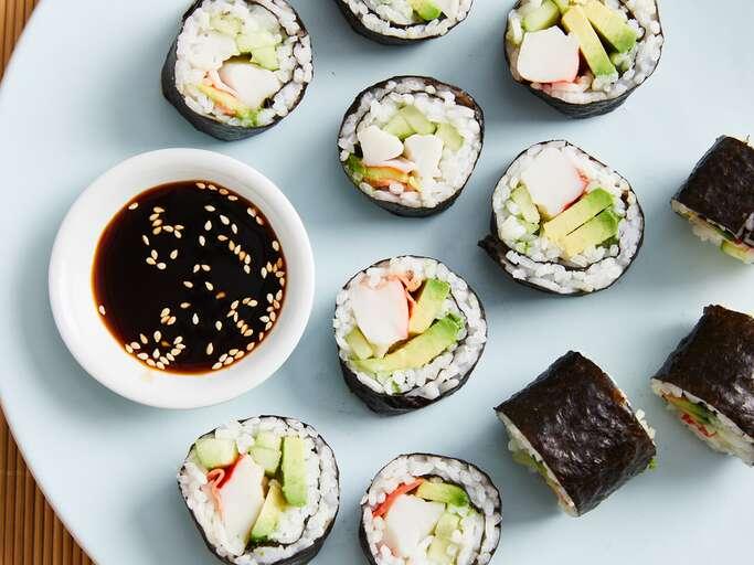 Sushi rolls can be filled with any ingredients you choose. Try smoked salmon instead of imitation crabmeat. Serve with teriyaki sauce and wasabi.