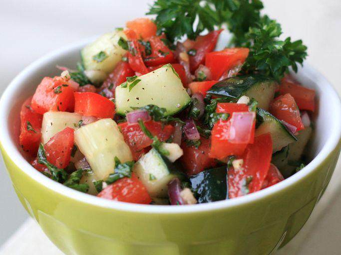 This Israeli tomato and cucumber salad combines chopped tomatoes, cucumbers, onion, parsley, mint leaves, and garlic with a drizzled dressing of lemon juice and olive oil.