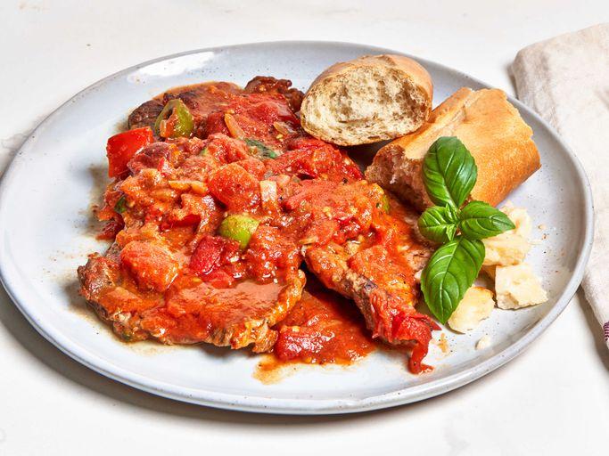 In this Italian steak pizzaiola recipe, thin beef rib-eye steaks are braised in a fresh tomato sauce with olives and parsley.