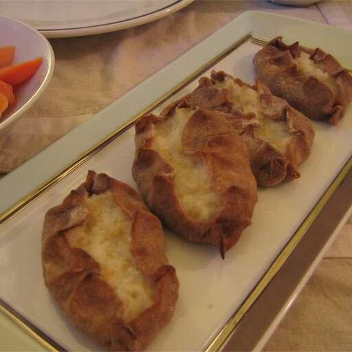 - On a lightly floured surface, roll each piece of dough out into a thin circle, 6 inches in diameter. The dough should be as thin as possible. Place about 3 tablespoons of the rice mixture in the center of each circle. Spread the mixture out to within 1 inch of the edges. Fold the edges of the dough upward, and crimp the edges so as to allow the pastries to hold their shape. Pinch the sides at each end to form a little boat. Place pastries about 3 inches apart on an ungreased baking sheet, and brush the tops with butter.