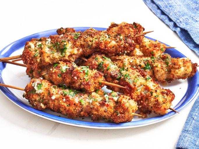- Stir together remaining salt and pepper with bread crumbs, panko, Parmesan cheese, and garlic powder in a shallow dish. Remove chicken from marinade and toss to coat in breadcrumb mixture, pressing to adhere as necessary. Thread chicken onto skewers and coat with olive oil cooking spray.