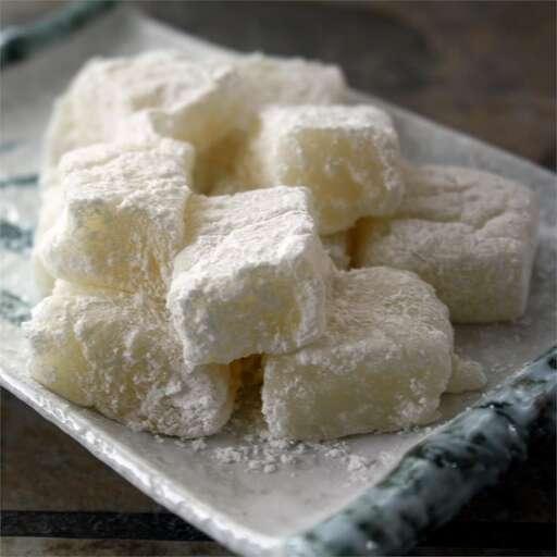 - Combine potato starch, remaining 1/4 cup sugar, and salt in a small bowl. Turn mochi out onto the plastic wrap and cut into 25 pieces using a plastic or wooden knife (metal knives tend to stick too much). Roll pieces in the potato starch mixture.