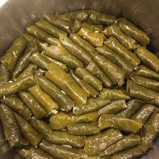4. Drizzle olive oil and remaining lemon juice over leaves, then pour in remaining broth to cover. Cover the pot and simmer for about 1 hour; do not let it boil as the stuffing may burst out of the leaves.