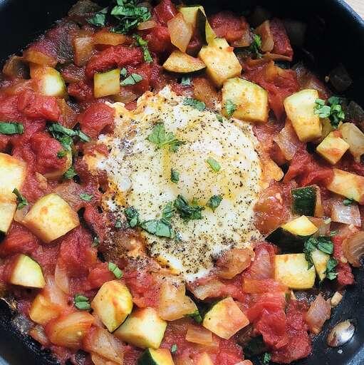 - Heat the vegetable oil in a skillet over medium heat. Stir in the garlic and onion; cook and stir until the onion has softened and turned translucent, about 5 minutes. Stir in zucchini; cook and stir for 5 minutes. Mix in the crushed tomatoes and hot pepper sauce. Cover and simmer for 10 minutes.